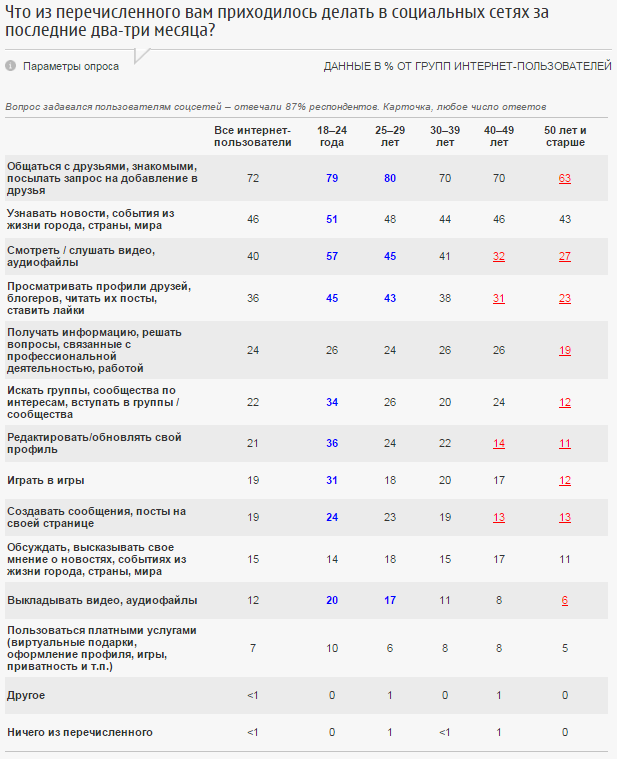 Чаще всего люди используют социальные сети для общения с друзьями и знакомыми (72%), чтения новостей (46%), просмотра видео и прослушивания аудио (40%) и просмотра профилей других пользователей (36%).