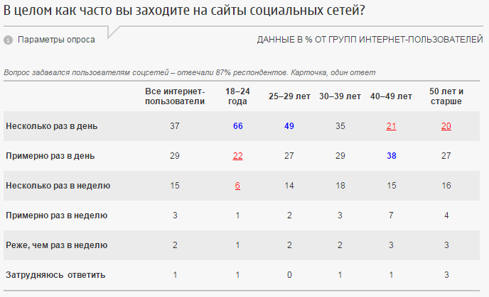 37% респондентов заходят в социальные сети несколько раз в день (это наиболее характерно для молодежи 66% –18–24 года и 49% – 25–29 лет). Примерно раз в неделю заходят 29% опрошенных (38% - люди в возрасте 40–49 лет). Реже раза в неделю к социальным сетям обращаются 2%.