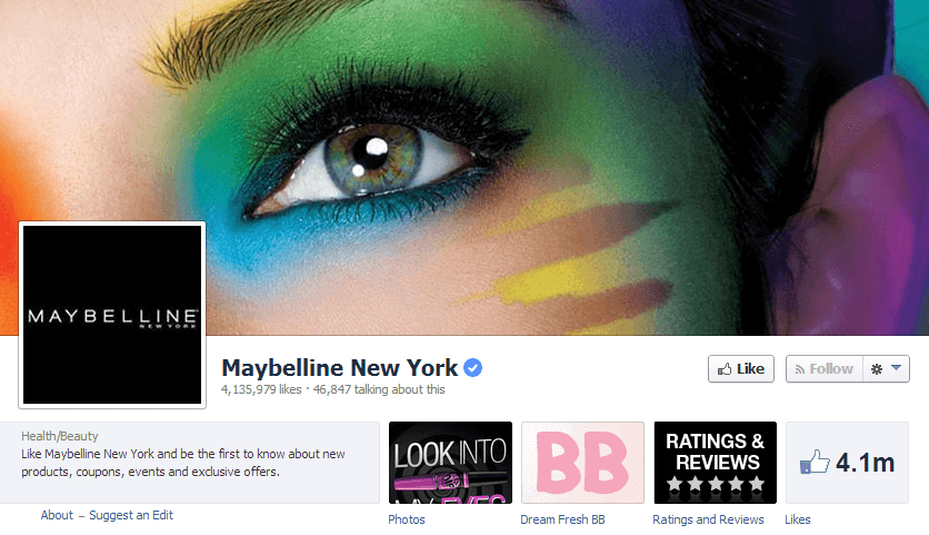 Стратегия Maybelline имеет три основания — вовлечение (engagement), обучение (education) и защита (advocacy). При планировании публикации материалов учитываются три фактора: частота (frequency), охват (reach), impact (влияние). Результаты: 4,1 миллиона подписчиков у страницы в Facebook и 43,6 миллионов просмотров видео в 2013 году.