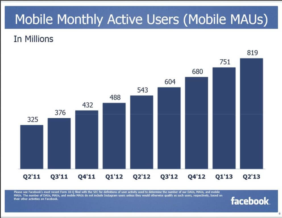 По данным на 30 июня 2013 года, ежемесячная аудитория Facebook составляет 1,15 млрд. активных пользователей (на 21% больше, чем по сравнению с прошлым годом). Из них 819 млн. - мобильные пользователи.
