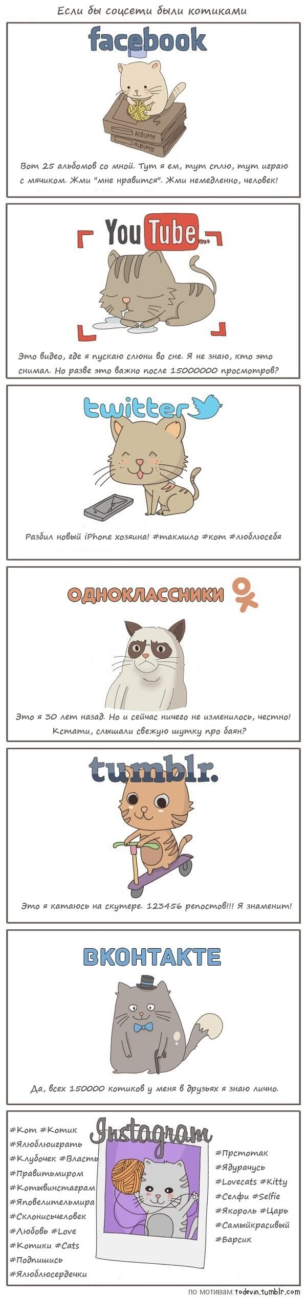 Как известно, интернетом правят коты, и немножко соцсети. Но коты все-таки больше. Видео с пушистым домашним любимцем, сосредоточенно вылизывающим свой бок, гарантированно станет хитом и соберет миллионы просмотров, а его фотография в Instagram будет куда популярнее потрясающих закатов, гор и крутых машин. Мы решили представить, как бы выглядели популярные социальные сети, если бы они были котами. Да-да, котиками. Всем смотреть и умиляться: