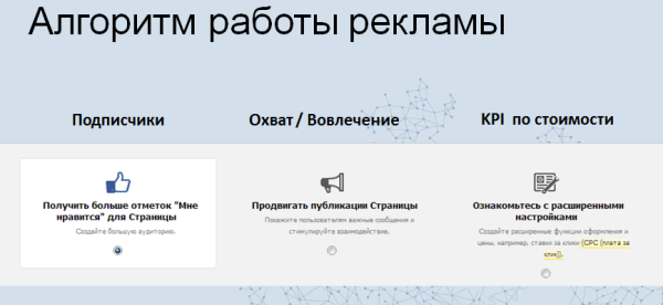- отдельно те, которые сфокусированы на охвате/вовлечении, т.к. в этом случае используются другой алгоритм и другие форматы размещения.