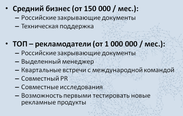 Также докладчик отметил, что рекламная сеть будет выделена в отдельный сегмент только тогда, когда она покажет значительные объемы на фоне сайта. «Сейчас сеть – это полпроцента трафика, который у нас есть, и эти 500 000 кликов – это меньше, чем ВКонтакте за день», - сказал Александр.