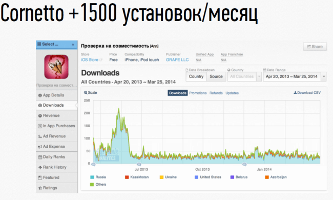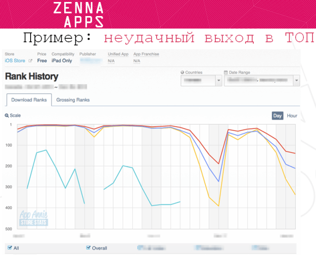 Пример неудачного выхода в ТОП – клиент настоял выйти с новым продуктом в ТОП на 3-4 дня. Как только платный трафик опускался, приложение падало вниз, т.к. оно не могло там продержаться «собственными» силами.