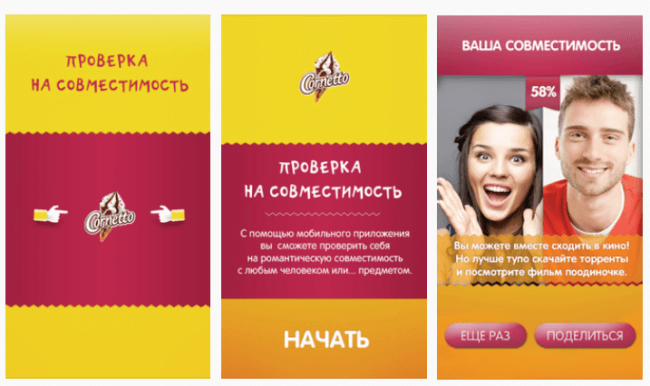 Приложение являлось частью кампании бренда «мороженого для влюбленных». Достаточно простая идея – пользователь запускает приложение, делает фото себя и другого человека, и ему выдается рандомный результат проверки.