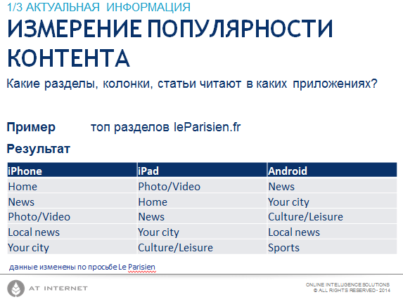 Le Parisien – это парижский бренд. За пределами Парижа он известен другими изданиями. И когда встал вопрос, как продвигать данное приложение, были исследованы данные о пользователях. Выяснилось, что только 30% пользователей приложения живут в Париже, остальные 70% - в регионах. Благодаря исследованию, редакция узнала, в каких регионах у них наибольший потенциал роста.