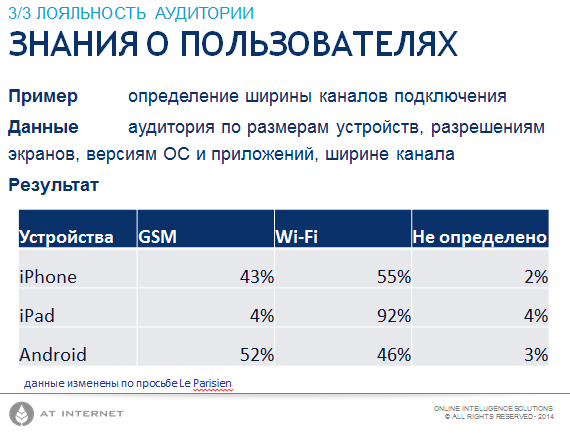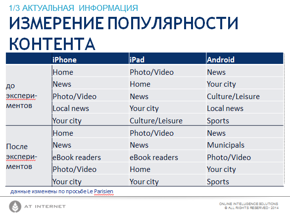 Как уже специалисты Le Parisien заметили ранее, на iPad пользователи чаще смотрели фото и видео. После анализа данных выяснилось, что это происходит в основном благодаря типу соединения – через WiFi. Поэтому в iPad-версию приложения было решено вставлять картинки и видео более высокого качества, что положительно повлияло на аудиторию – за неделю она выросла на 8%.
