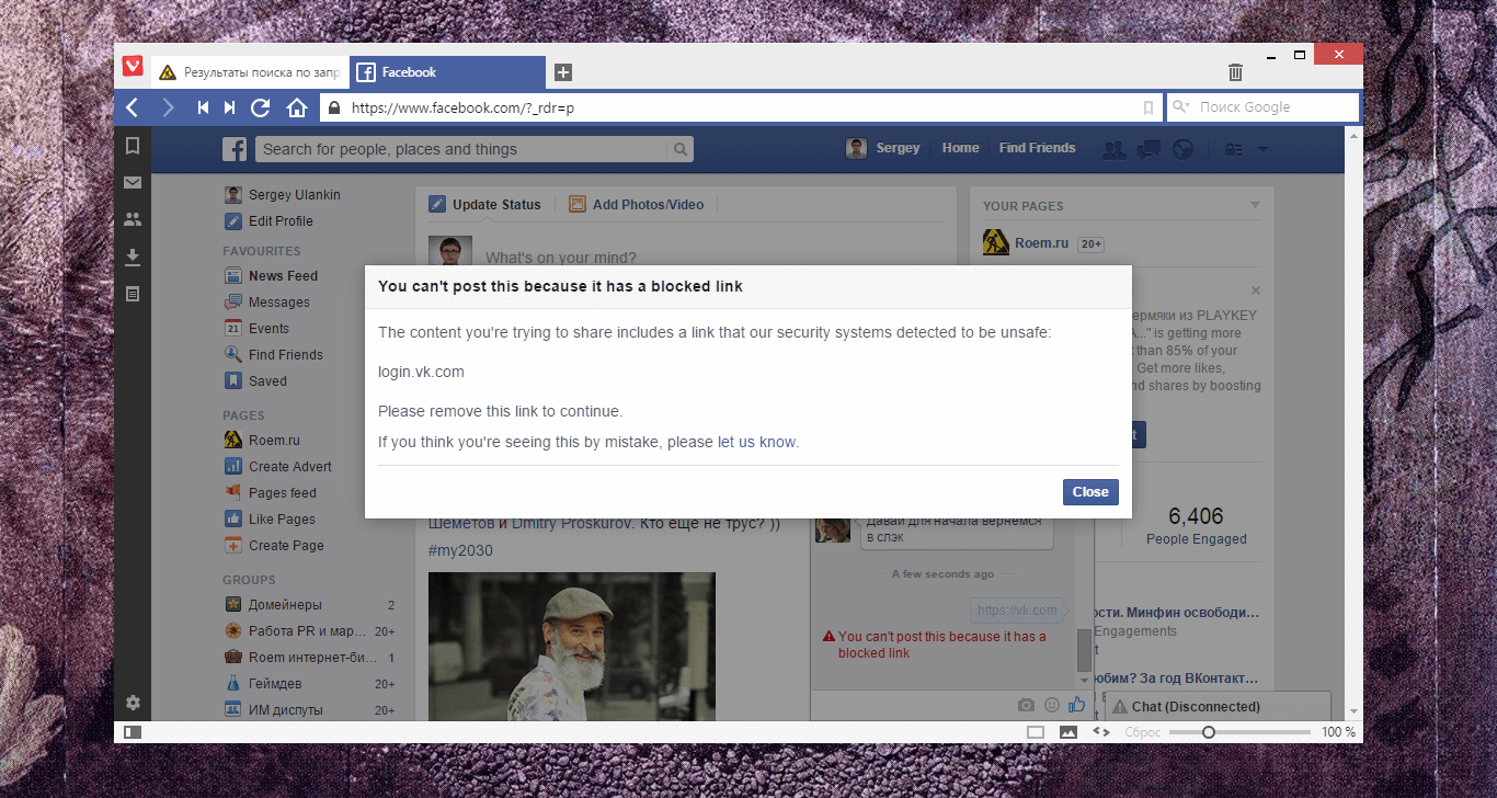 Социальные сети Facebook и Instagram начали блокировать ссылки на ВКонтакте. При попытке пользователей отправить в комментарии к фотографии ссылку на https://vk.com, соцсети демонстрируют сообщение об ошибке.
