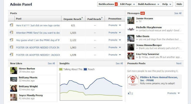 Не так давно в панели администратора в верхней части Facebook-страницы нововведение: вместо секции «Уведомления» появился раздел «Публикации», в котором отображены текущие показатели по эффективности опубликованных постов (органический и платный охват). А рядом с ними кнопка «Продвигать».