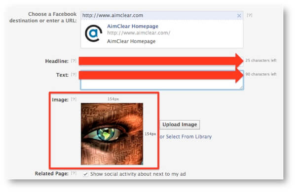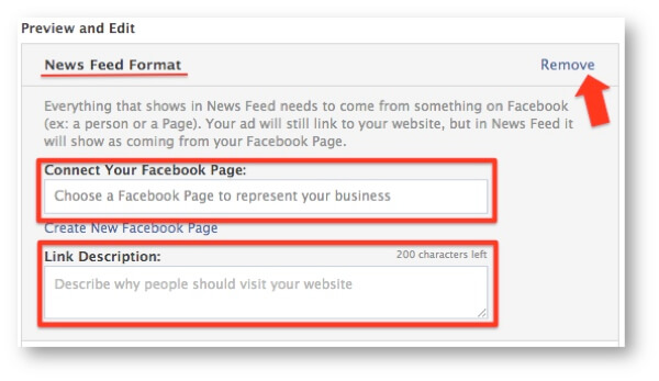 Если прокрутить страницу вниз, можно увидеть, что Facebook создает два рекламных блока одновременно: одно объявление в Ленте и другое в правой колонке. Таким образом, пользователю предоставляется возможность выбрать страницу Facebook, к которой необходимо привязать объявление, (или создать абсолютно новую страницу); и добавить до 200 дополнительных символов к описанию рекламируемой ссылки.