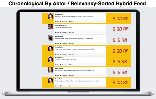 Этот механизм стремится определить посты конкретного пользователя о событии, происходящем в режиме реального времени, и отображать их в хронологическом порядке в верхней части ленты (как в Twitter), но оставляя остальную ленту без изменений.