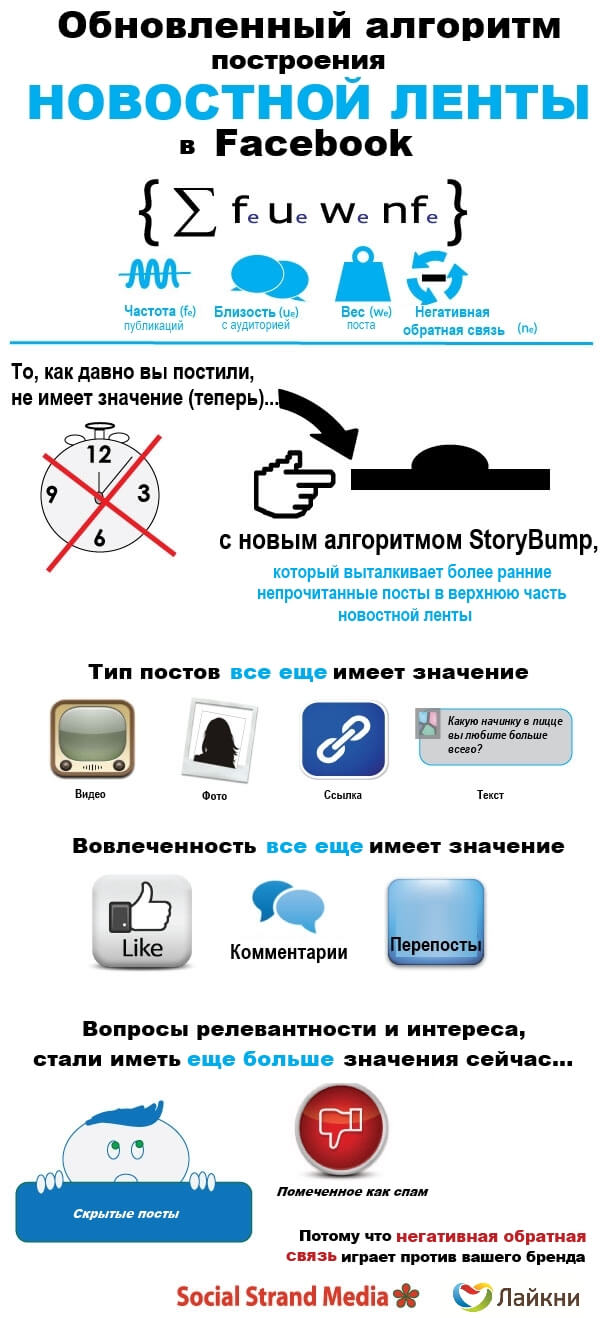 UPD: Издание Social Media Today наглядную инфографику, показывающую что будет учитывать в ранжировании обновленный алгоритм выталкивания постов (Story bumping) в новостной ленте Facebook:
