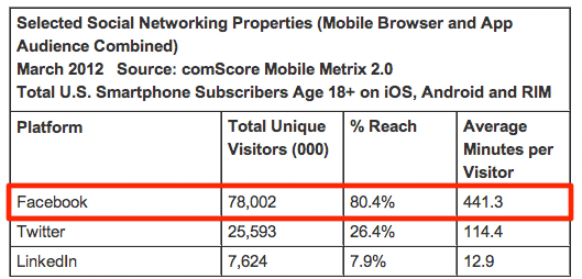 Кроме того, по данным comScore, в марте 2012 г. американские пользователи провели больше времени на мобильной версии Facebook (441 мин.), чем на классическом вебсайте (391 мин.).