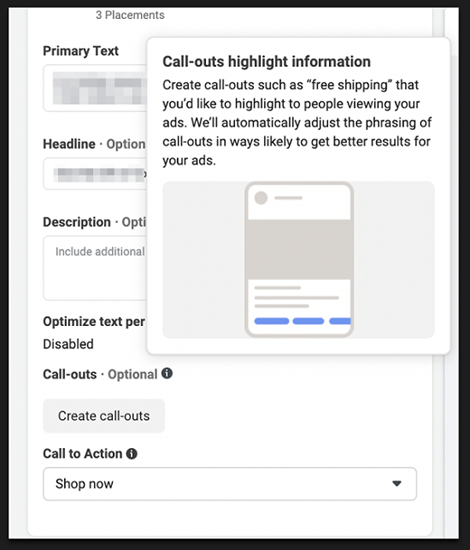 Западные специалисты обратили внимание, что Facebook позволил добавлять в рекламные объявления уточнения (сall-outs).