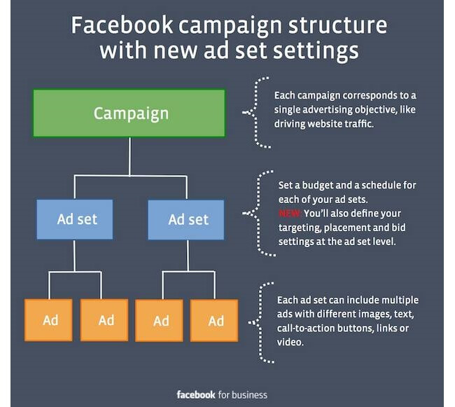 Facebook изменения в структуре рекламных кампаний — теперь настройки аудитории, ставки и место размещения кампаний задаются на уровне группы объявлений, а не на уровне объявлений, как было раньше.