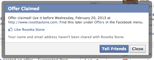 По данным соцсети, за весь период существования предложений ими 42 млн. Facebook-пользователей. Однако далеко не все пользователи применяли купон, после того как получали его на Facebook. Новый формат может значительно повысить эффективность такой рекламы: возможность сразу перейти на сайт рекламодателя и напоминания о действующих офферах, несомненно, положительно скажутся на количестве активированных купонов.
