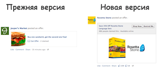 По словам представителя Facebook, тестирование нового формата ведется с несколькми крупными ритейлерами, для всех остальных офферы доступны в прежнем дизайне.