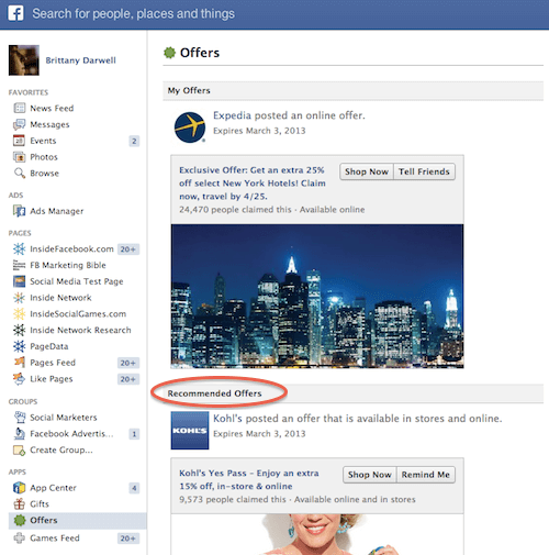 (04.03.2013) UPD: Facebook активно расширяет возможности офферов: соцсеть тестировать "Рекомендуемые предложения". Новый рекламный формат демонстрируется пользователю не в общей новостной ленте, а в специальном разделе «Предложения» наряду с офферами, которые уже были приняты.