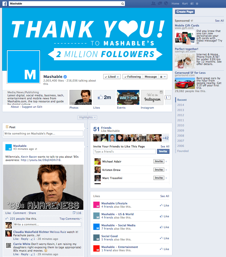 Новая версия страниц по-прежнему состоит из двух колонок, однако в правой колонке теперь отображается вся Хроника (Timeline) страницы, а левая содержит информацию о бренде или компании. В предыдущей версии обе колонки относились к Хронике и отображали посты.
