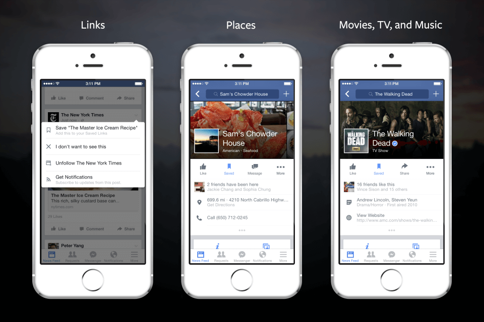 Каждый день люди находят огромное множество интересной информации в Facebook, и у них не хватает времени, чтобы изучить ее должным образом. Теперь вы можете сохранить найденные в Facebook материалы и прочесть их позже, когда у вас будет больше времени.