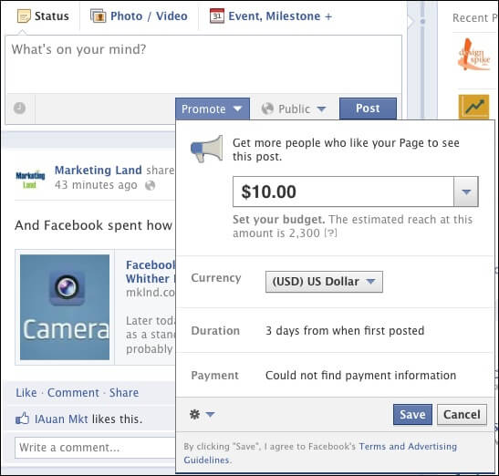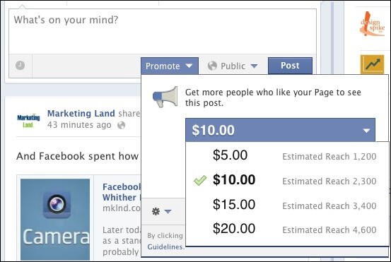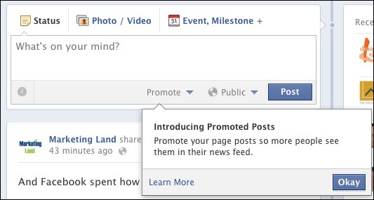 В настоящее время воспользоваться услугой Promoted Posts может ограниченное число участников Facebook, подпавших под эксперимент. К примеру, брендовая страница Marketing Land может создать себе продвинутые посты, а странице SearchEngineLand, имеющей в 7 раз больше лайков, новый инструмент пока не доступен.