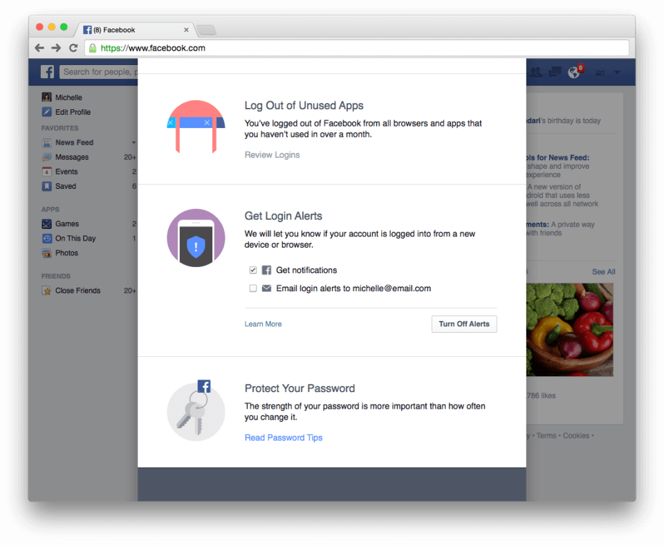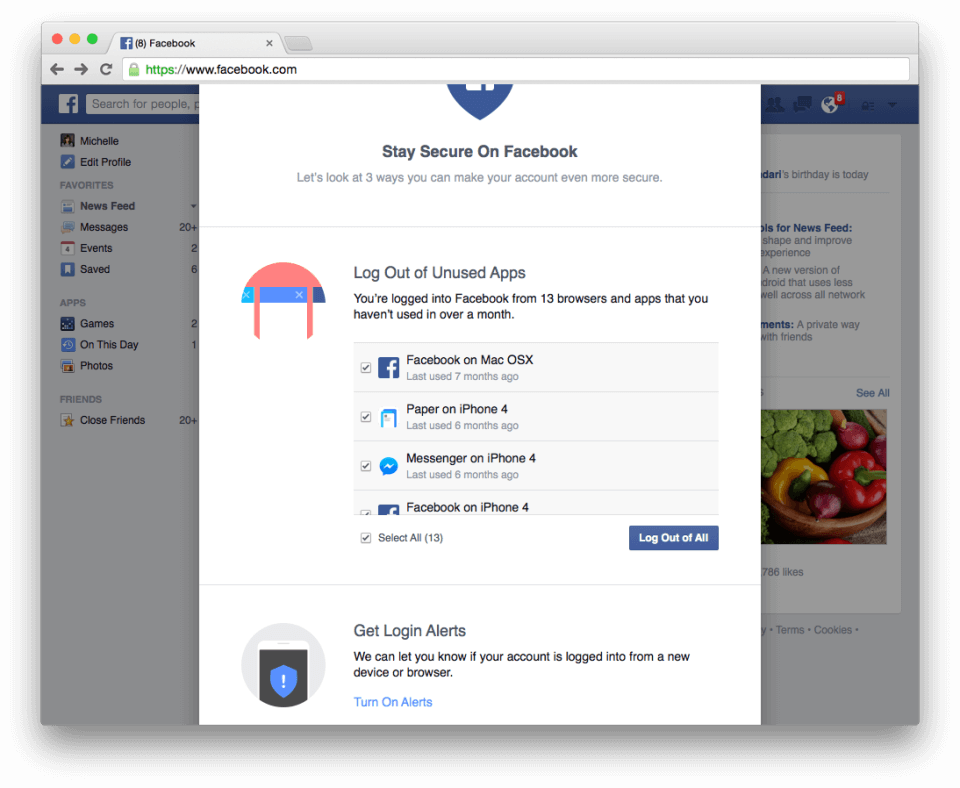 Первый шаг поможет пользователям выйти из Facebook на тех устройствах, которые не используются. Второй шаг даст возможность включить оповещения «login alerts», которые проинформируют пользователя о том, что кто-то пытался войти в его аккаунт с незнакомого устройства. На третьем этапе пользователь получит несколько советов по поводу поддержания безопасности и уникальности пароля.