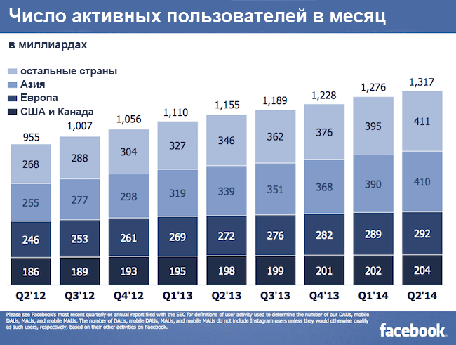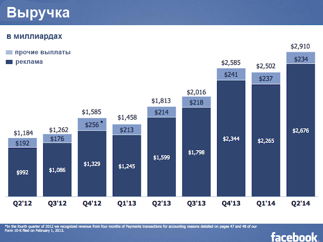 Facebook представил финансовый отчет за второй квартал 2014 года. Для компании период закончился более чем успешно – выручка составила $2,91 млрд (хотя аналитики прогнозировали $2,81 млрд ), а число пользователей соцсети достигло 1,3 млрд по всему миру.