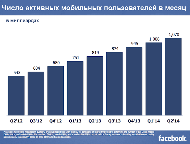 - Число мобильных пользователей продолжает расти – в месяц через мобильные устройства с Facebook заходят 1,07 млрд. Около трети пользователей – 399 млн – используют для доступа в соцсеть только мобильные устройства.