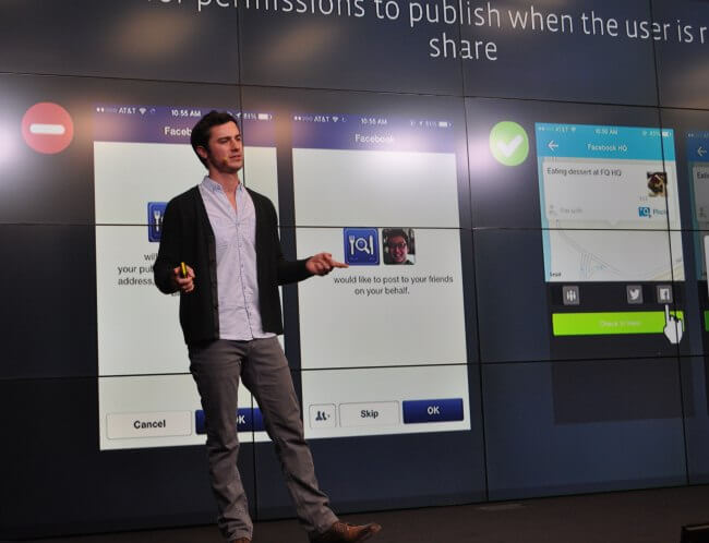- прежде чем запостить информацию от лица пользователя в Facebook, приложение должно спросить разрешение на это