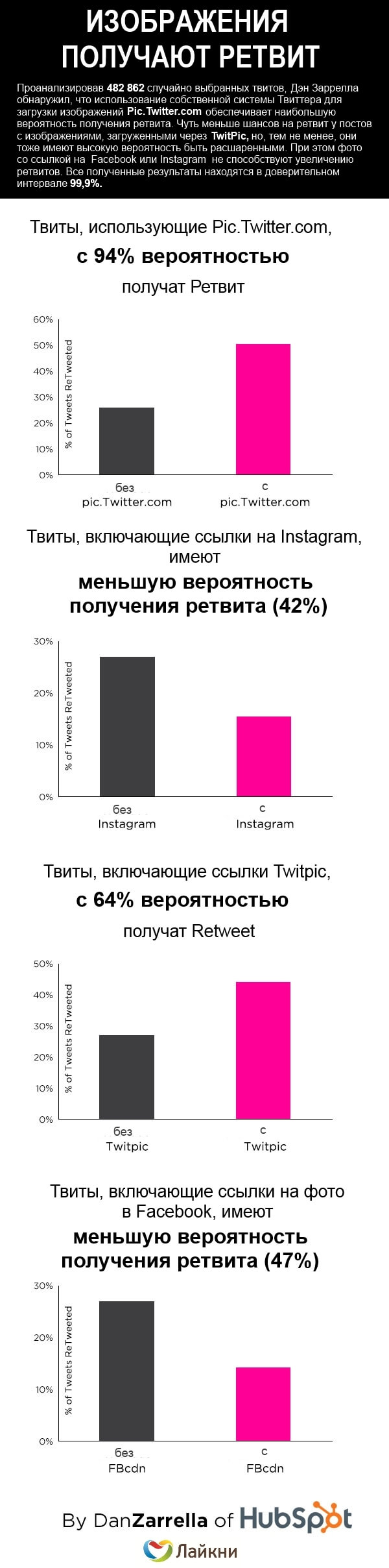 Твиты с изображениями, загруженными через pic.Twitter.com почти в 2 раза чаще ретвитили, в то время как использование Twitpic увелиичивало шансы на ретвит на 60%.