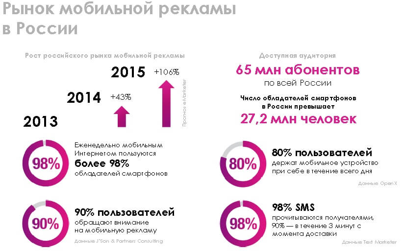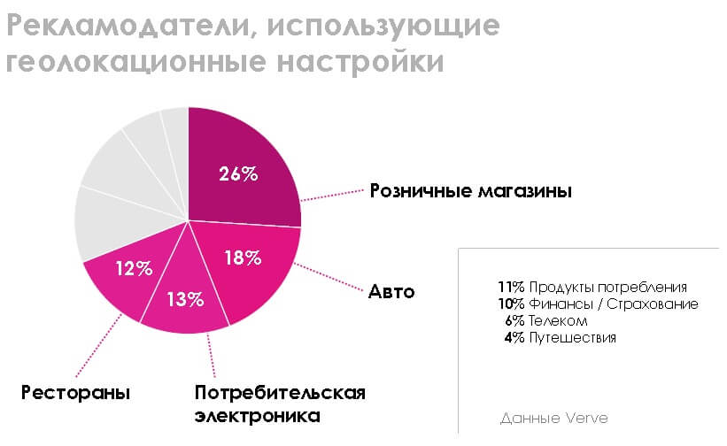В этом году, согласно исследованиям, 34% компаний по всему миру планировали использовать геотаргетированную мобильную рекламу. Из тех, кто уже ею пользуется, преобладают розничные магазины, автомобильные компании, рестораны.