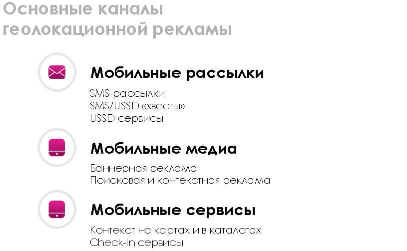 Существует несколько каналов геолокационной рекламы: мобильные рассылки, мобильные медиа, мобильные сервисы.