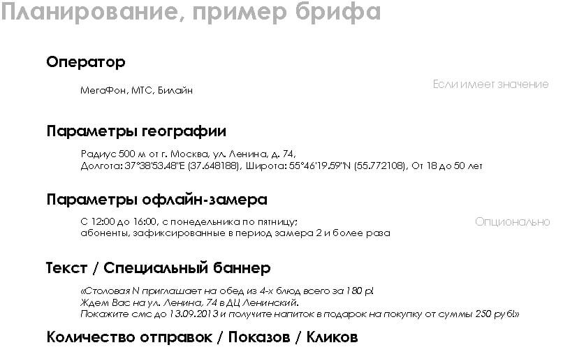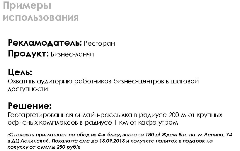 - онлайн (устанавливаем точку на карте и доносим рекламное сообщения прямо сейчас до попадающих в эту точку пользователей);