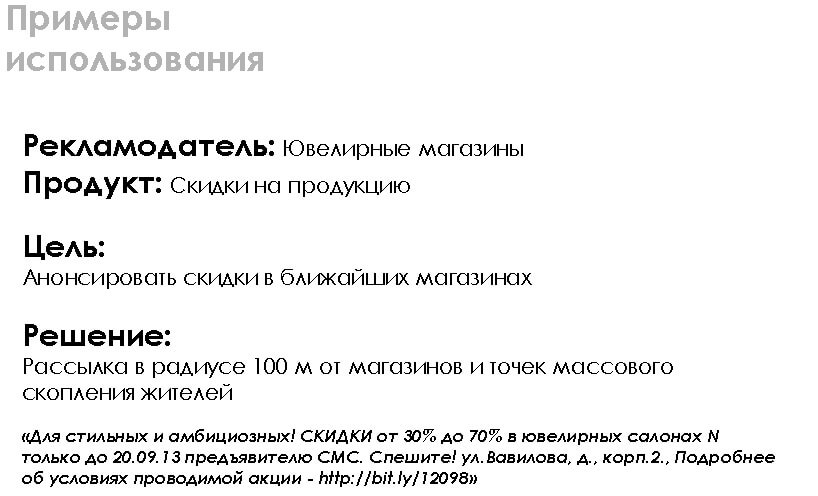 - офлайн (опредяем абонентов, находящихся в определенном радиусе от заданной точки в определенное время, чтобы использовать эти данные для уточнения адресатов последующих рассылок).