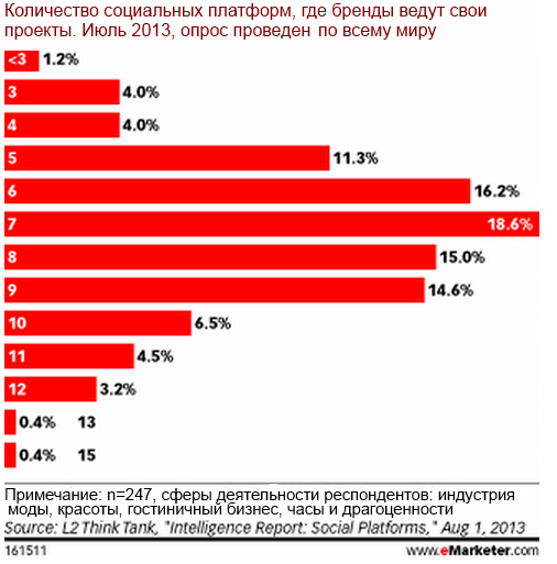 По данным L2 Think Tank, более 60% компаний, работающих в сфере розничной торговли и путешествий, ведут проекты более чем на 7 социальных платформах. В то время как 5% ограничились тремя или менее.