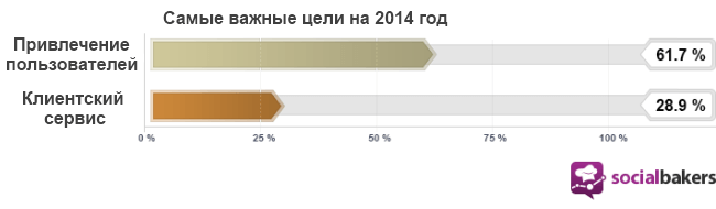 62% опрошенных отметили, что привлечение новых пользователей через социальные сети – важная задача на 2014 год. Тем не менее, клиентский сервис стоит на первом месте всего у 28% специалистов.