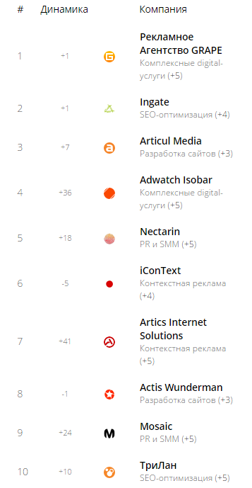 Рейтинг объединяет игроков из всех сегментов агентского digital-рынка: веб-разработка, SEO, контекстная реклама, PR, SMM, мобильный маркетинг и разработка, комплексные digital-услуги. Методика основана на анализе позиций игроков в 56 локальных нишевых рейтингах.