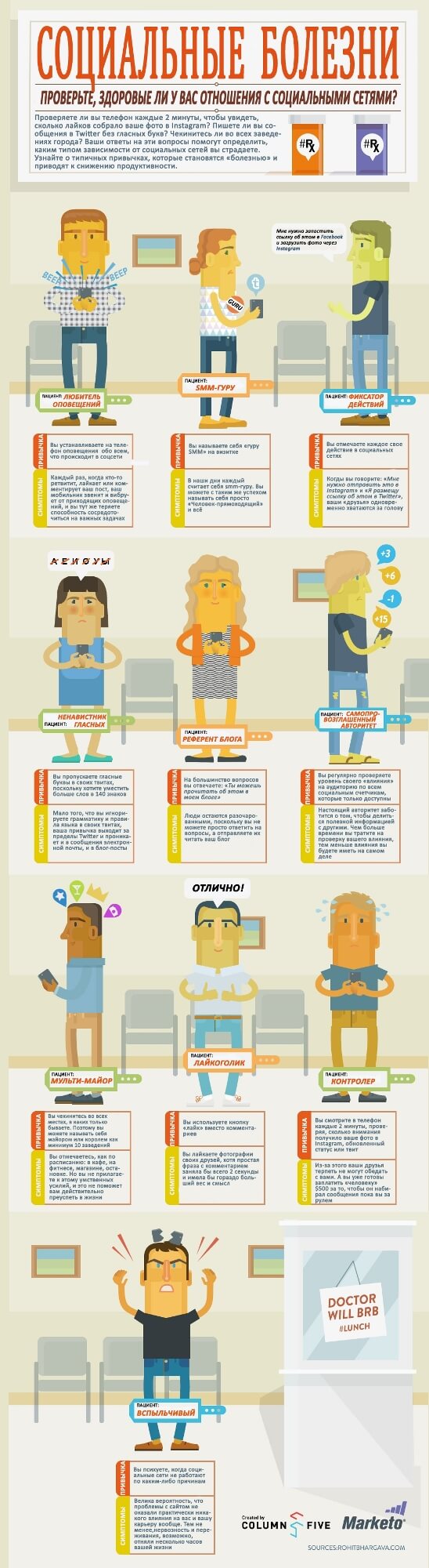 Проверьте, здоровые ли у вас отношения с социальными сетями? Представленная ниже инфографика позволит выявить 10 типичных привычек, которые превращаются в «социальные болезни».
