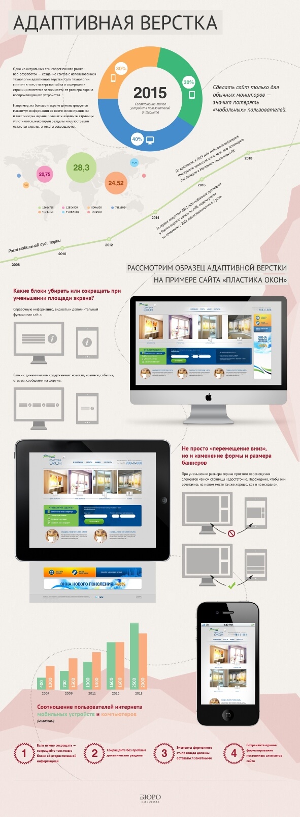 Digital-агентство "Бюро Пирогова" сделали интересную инфографику об адаптивном дизайне. Responsive web design - это уже не просто мода для любителей "быть в тренде", в 2014г, всего-то через 2 года, мобильная аудитория обгонит аудиторию настольных ПК. Самая пора готовиться к переменам.