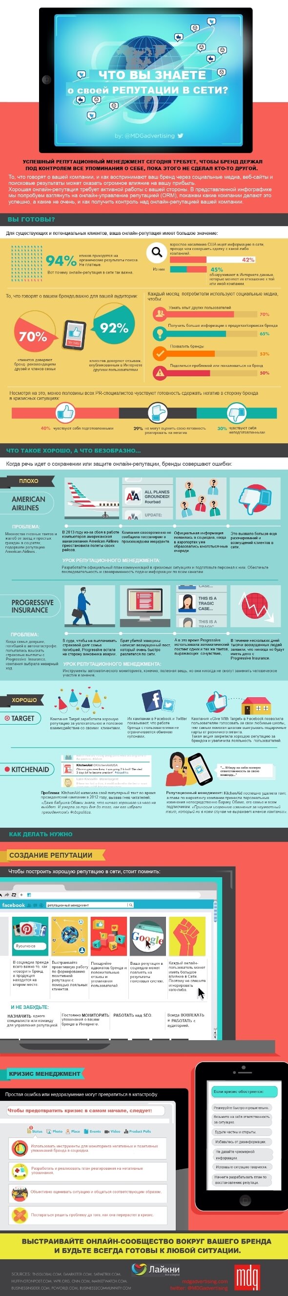 MDG Advertising инфографику, в которой наглядно представлены советы по построению онлайн-репутации, предотвращению и выходу из кризисных ситуаций на примере конкретных брендов.