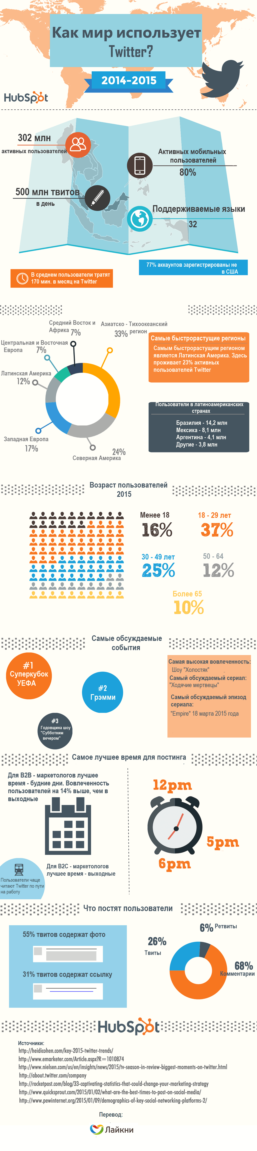 Сколько же человек использует Twitter? Кто они, эти активные пользователи, и где они живут? Какие события кажутся им самыми интересными? Что за сериалы они смотрят? Ответы на эти и другие популярные вопросы о Twitter в нашей инфографике.