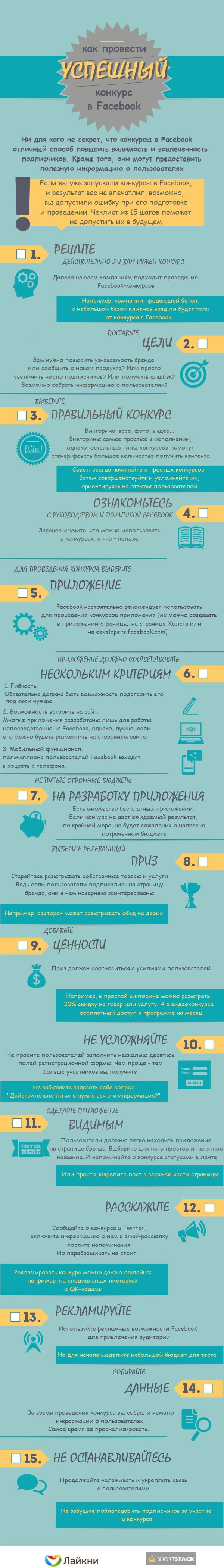 Бренды уже давно поняли, лучший способ увлечь и заинтересовать свою аудиторию на Facebook - это предложить им поучаствовать в конкурсе. Однако как именно проводить конкурс в соцсети многие компании представляют достаточно смутно. Небольшая шпаргалка из 15 пунктов позволит не забыть все важные моменты касательно подготовки конкурса и сделать его более эффективным.