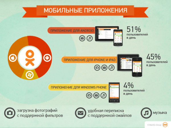 На данный момент можно установить Одноклассники для следующих мобильных платформ: Android, iOS и Windows Phone, а скоро появится и мобильная версия сайта Одноклассники для Windows 8. В приложении можно делать практически все то же самое, что и на веб-сайте: переписываться с друзьями, обсуждать интересные темы, загружать фотографии целыми альбомами, использовать фильтры для фотографий, слушать музыку, смотреть видео и многое другое. Подробности про мобильные приложения Одноклассников смотрите в инфографике: