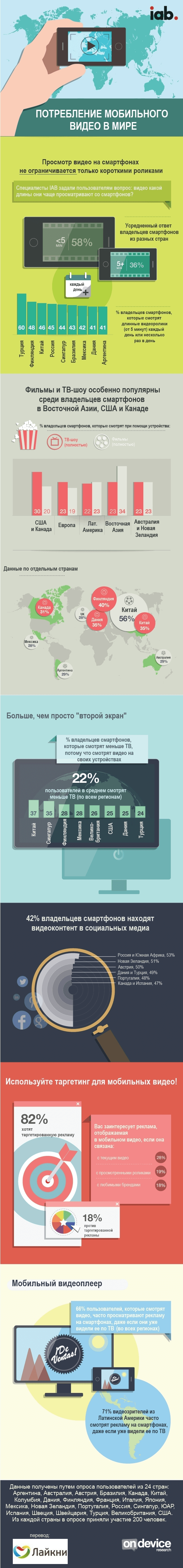 Мобильные устройства все чаще используются для просмотра стриминговых длинных видео, говорится в «Mobile Video Usage: A Global Perspective» от IAB. 36% респондентов по всему миру как минимум раз в день смотрят видео, длина которого превышает 5 минут. Еще больше данных — в инфографике ниже:
