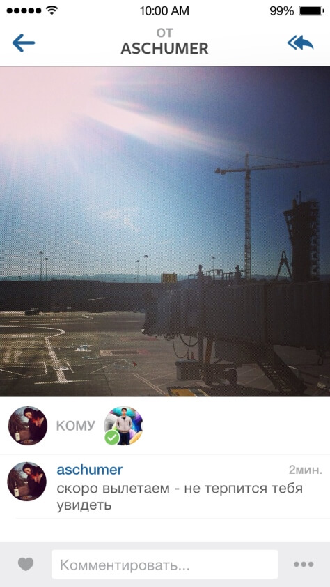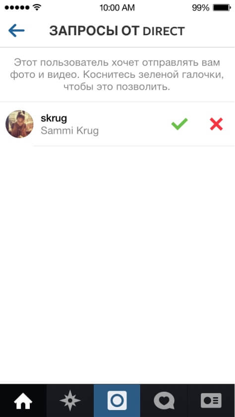 В новой версии Instagram в правом верхнем углу новостной ленты появился значок Direct. Коснувшись его, вы сможете зайти в папку сообщений и увидеть фото и видео, отправленные вам.