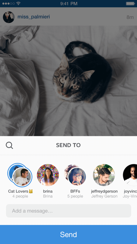 - Новая “стрелка” re-share позволяет пользователям послать любое фото/видео из их Instagram-ленты одному или нескольким людям.