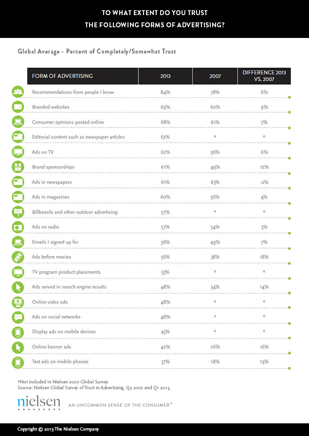 Рейтинговое агентство Nielsen выяснило, что, несмотря на то, что потребители по-прежнему в большей степени доверяют традиционным источникам, интернет-реклама становится не менее эффективным инструментом. Данный вывод основывается на сравнительном анализе общественного мнения в 2007 и 2013 годах. В опросе приняли участие 29 000 человек из 58 стран, включая Россию.