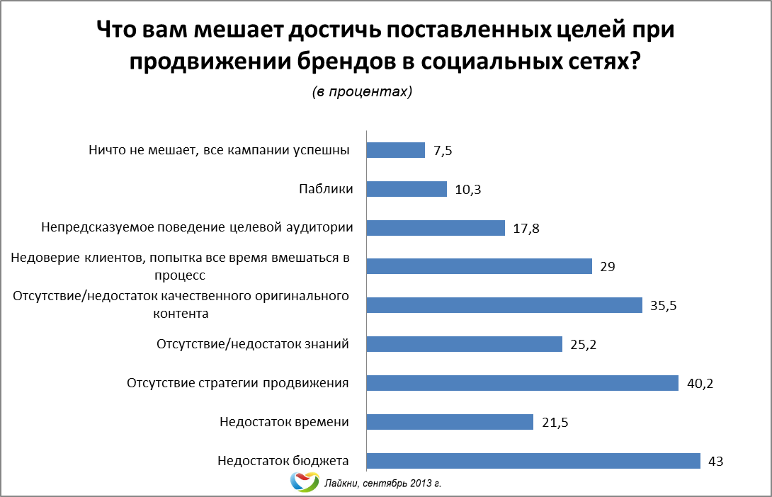 Одна из главных целей в SMM для клиентов – повышение узнаваемости бренда. При этом основным препятствием для достижения поставленных задач является недостаток бюджета. Портал Лайкни подвел итоги интернет-опроса SMM-специалистов, который проходил с 15 августа по 16 сентября 2013 г.