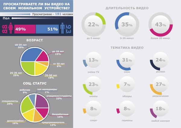 Согласно результатам, 90% опрошенных просматривают видео на своих мобильных устройствах. Самой активной аудиторией стали пользователи возрастных групп от 18 до 25 лет (35%) и от 25 до 35 лет (25,4%). Гендерное соотношение примерно одинаковое. Социальный статус самой активной аудитории - это студенты/учащиеся (22,7%) и специалисты (23,7%). Реже остальных видео на экранах своих телефонов и планшетных компьютеров просматривают ТОП-менеджеры (1,1%).