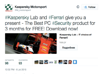 В то же время «Лаборатория Касперского» таргетировала показ твита на всех пользователей, следивших за видеотрансляцией и обсуждавших гонки в Twitter.